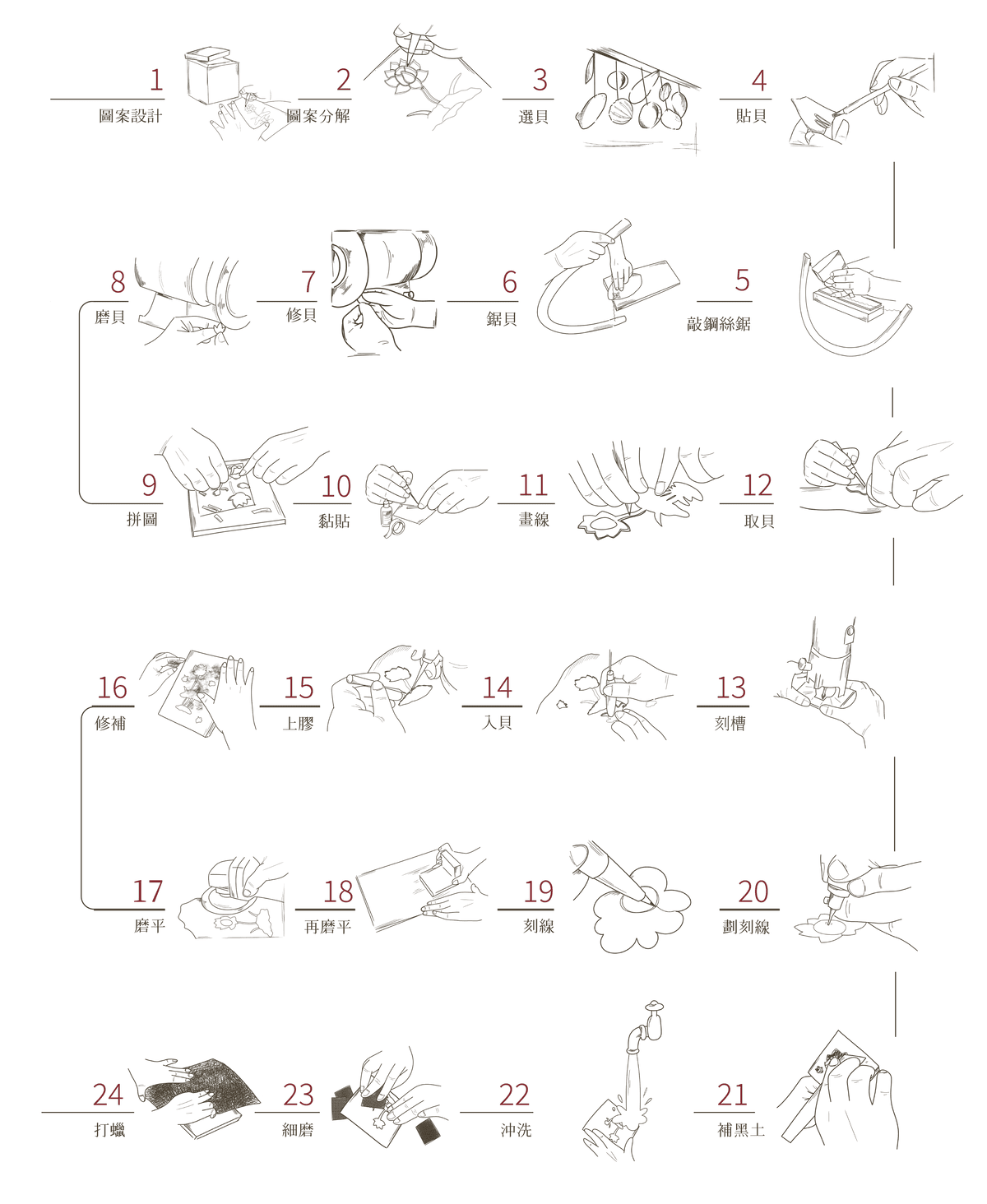 螺鈿,又稱為螺填、螺甸、鈿嵌、陷蚌等。「螺」,指的是名詞的「螺類」,如海螺、田螺、貝殼等具有螺旋形狀的外殼;「鈿」唸作"ㄉㄧㄢˋ",指的則是動詞的「填入」。「螺鈿」也就是填入螺類的意思,簡單來說就是鑲嵌貝殼。